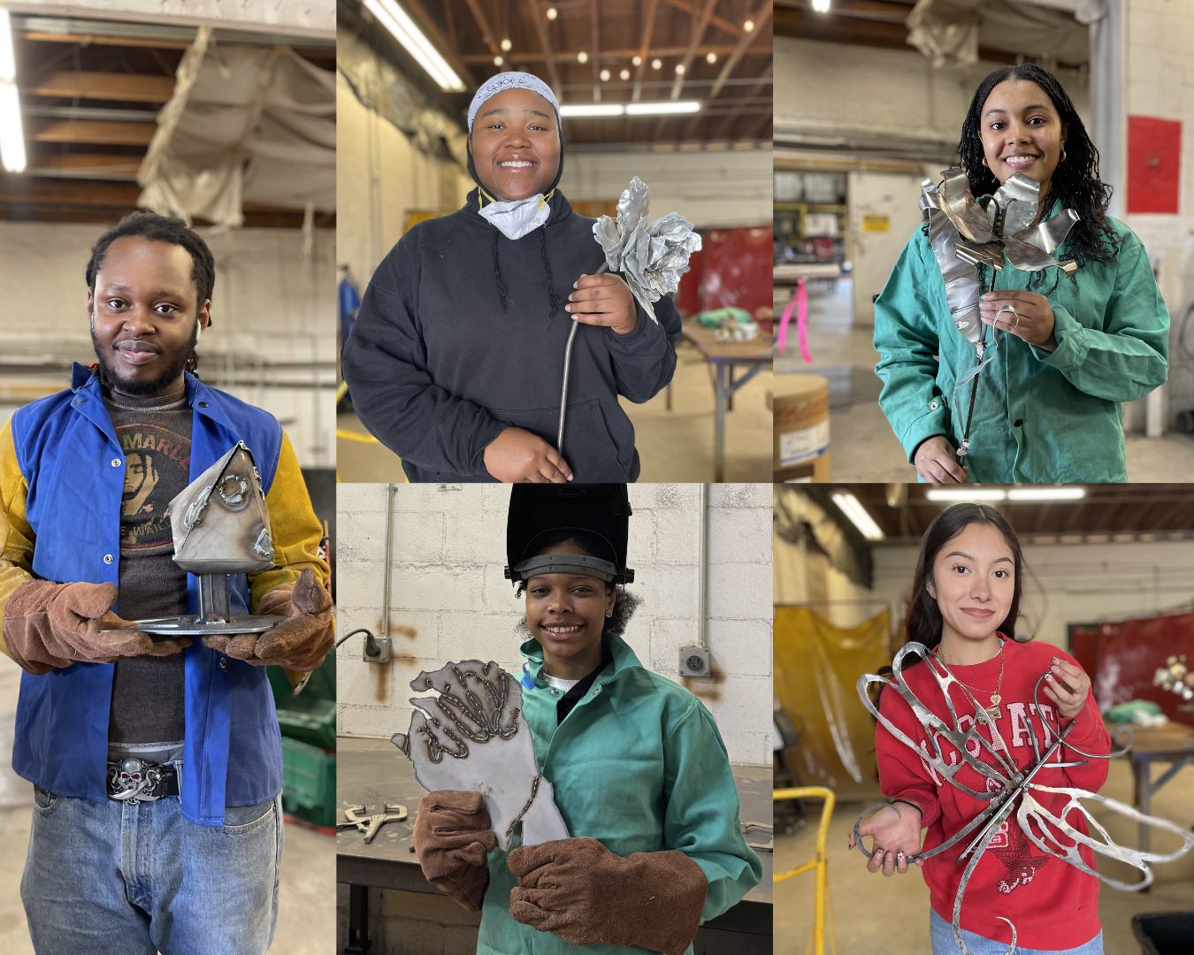 Students from North Carolina Central University's Sculpture 2 course joined Metals Instructor Kendra Plumley for a multi-week sculptural welding workshop. Students gained experience using the MIG welders, plasma cutters, and angle grinders to create sculptural pieces of their own designs out of steel.