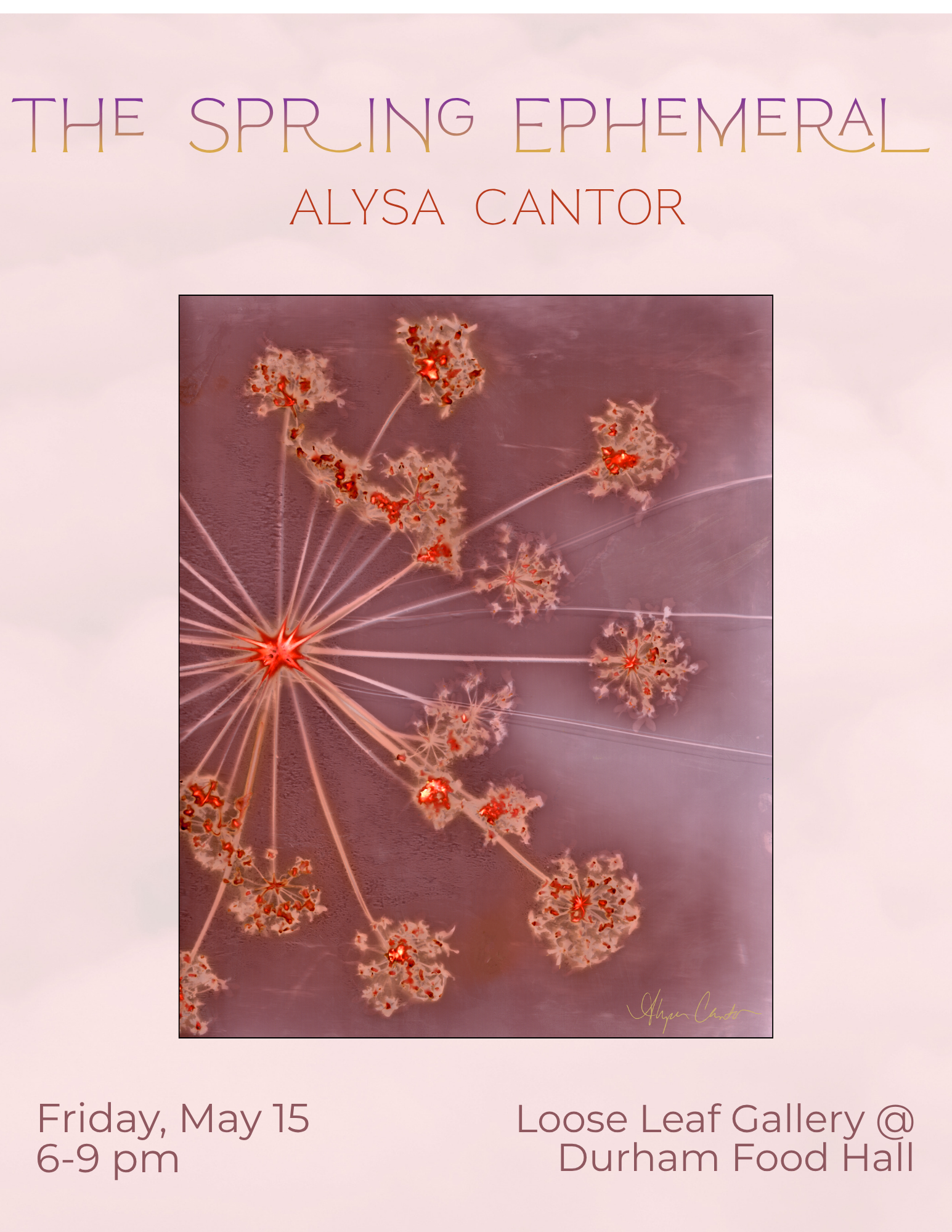 Join Liberty Arts in the Durham Food Hall’s Looseleaf Gallery for a presentation of work by artist Alysa Cantor. The Spring Ephemeral takes its name from the plants that complete their entire life cycle in the fleeting window before the forest canopy closes. This collection of experimental cyanotypes offers what the light remembers and serves as a series of field notes on transience.