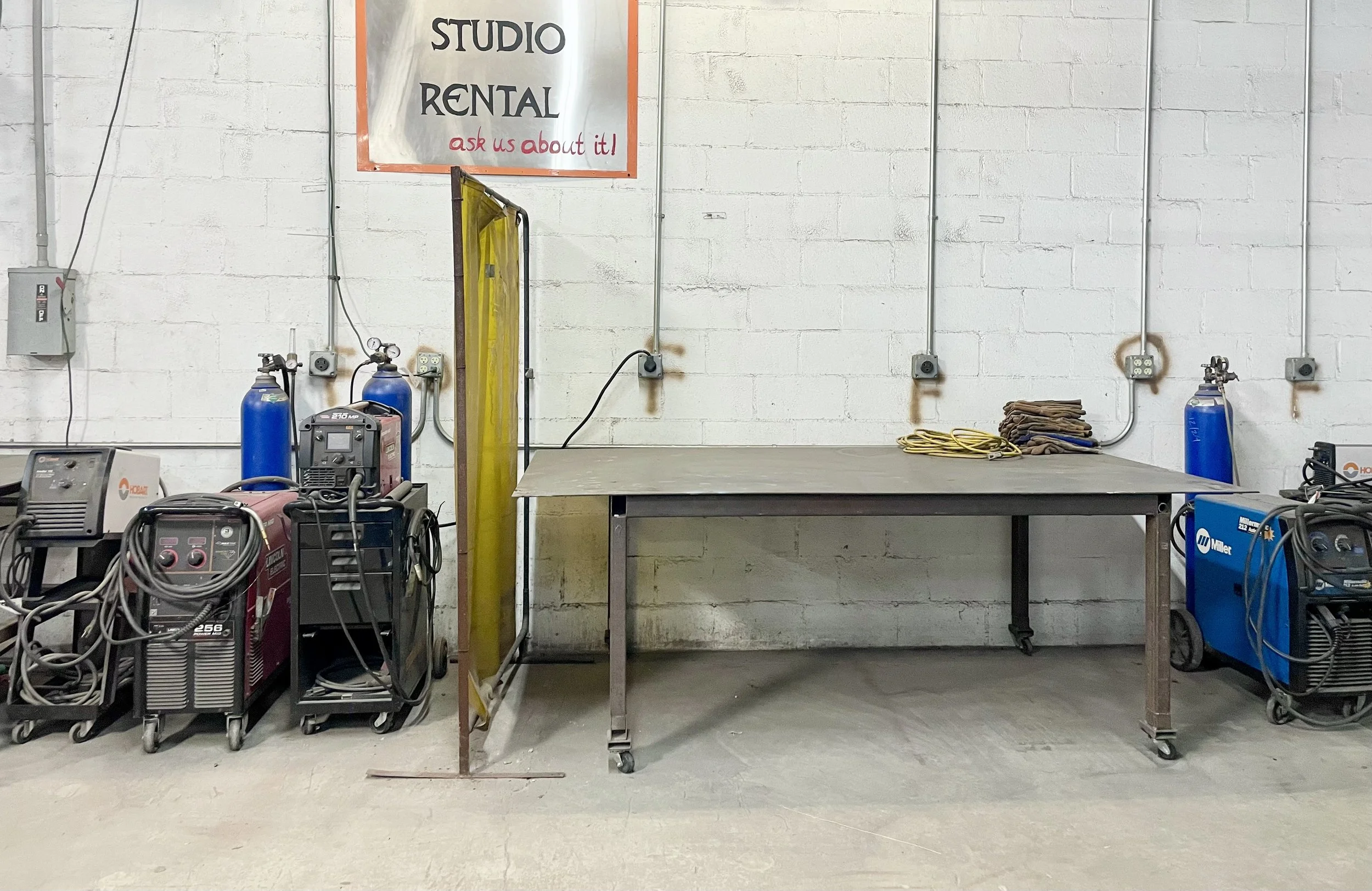 Renters will have access to welding time within the shared studio warehouse complex. Introductory course or demonstration of skill is required for renting workshop time.